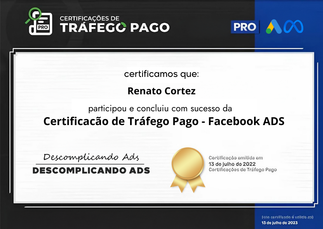 Meu principal objetivo é garantir que sua empresa alcance os melhores resultados. Para isso, estou sempre aprimorando minhas habilidades, aprendendo diretamente com os maiores especialistas em tráfego pago do Brasil, através da comunidade Descomplicando Ads. Além disso, faço parte do seleto grupo de 2% dos profissionais que foram certificados e aprovados pela própria Descomplicando Ads em Google Ads e Facebook Ads.